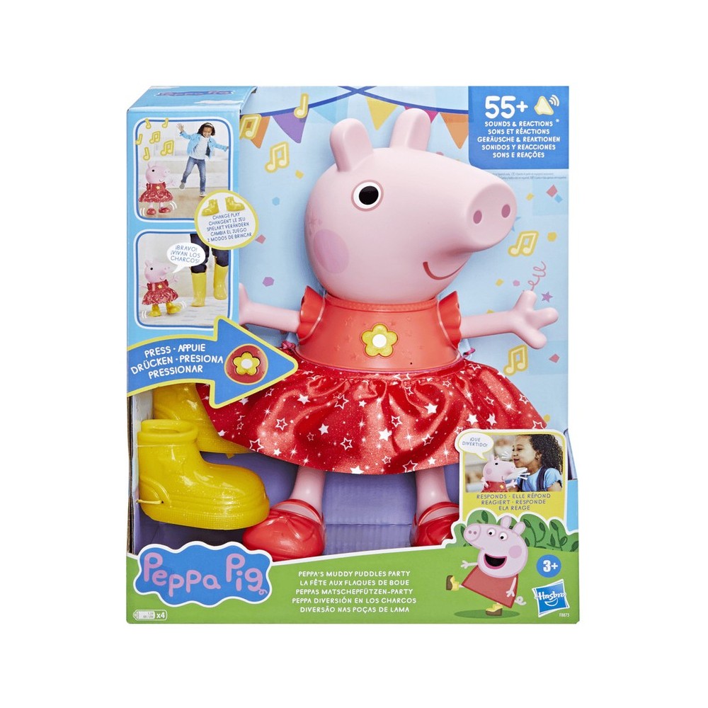 ¡Es una fiesta de Peppa, y los pequeños están invitados para unirse a la diversión con la muñeca Peppa Diversión en los charcos! ¡Este juguete interactivo que habla, canta y baila para niños a partir de 3 años cautivará la imaginación de los pequeños y los invitará a moverse y bailar con su mejor amiga, Peppa! Los pequeños pueden ponerle y quitarle a la muñeca de Peppa sus emblemáticas botas amarillas para pasarla al modo "charcos de barro", al modo "Fiesta", activar sonidos y frases, la canción y el baile y un juego. También reacciona a sonidos con frases o efectos de sonido. Los pequeños que adoran las figuras y sets de juego de Peppa Pig se divertirán con este juguete electrónico súper-interactivo para niños y niñas. MÁS DE 55 SONIDOS Y REACCIONES: Más de 55 sonidos, frases y reacciones ofrecen muchas maneras de jugar con este juguete interactivo. (Habla solo en inglés). LAS BOTAS CAMBIAN EL ESTILO DE JUEGO: Ponle o quítale las botas para descubrir todas sus frases, efectos de sonido, canciones y juegos MODO DE FIESTA: Sin las botas, el juguete está en modo fiesta. Presiona el botón en su vestido para escuchar distintos sonidos y frases con tema de fiesta, la canción de Peppa Pig y un juego de imitación de Peppa Fabricante: Hasbro Importador: Hasbro Colombia Recomendaciones: Requiere de la supervisión directa de un adulto, puede contener partes pequeñas, riesgo de asfixia o ahogamiento, no destinar este juguete para menores por debajo de la edad establecida en la etiqueta. Edad mínima sugerida: 3 años Lote: Dato variable. Se puede verificar en el sticker que trae el producto físico. Fecha de fabricación: Dato variable. Se puede verificar en el sticker que trae el producto físico.