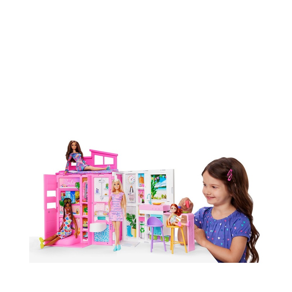 ¡Imagina nuevas historias con la muñeca Barbie y su casa Glam! Tiene 4 áreas de juego y 11 accesorios para disfrutar de horas de diversión, aventuras e imaginación. Además, tiene detalles realistas para enriquecer la experiencia de juego como una cocina, un baño, un dormitorio y un área de películas. ¡La Getaway House de Barbie es el regalo perfecto para niñas de 3 años en adelante! Los colores y las decoraciones pueden variar. Incluye 1 muñeca Barbie y 11 accesorios.