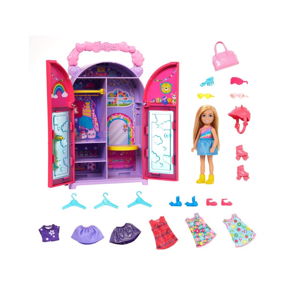 ¡Es hora de prepararse para salir con la muñeca Chelsea! Abre el set de clóset y descubre un armario de ensueño con 15 prendas y accesorios. Mezcla y combina los conjuntos para crear cuatro looks completos. Con divertidas piezas como vestidos, un casco de bicicleta de gatita, gafas de sol con forma de corazón, pantuflas de conejito y un antifaz para dormir, ¡las niñas pueden vestir a la muñeca Chelsea para cualquier ocasión! La muñeca no puede mantenerse de pie por sí sola. Los colores y las decoraciones pueden variar.